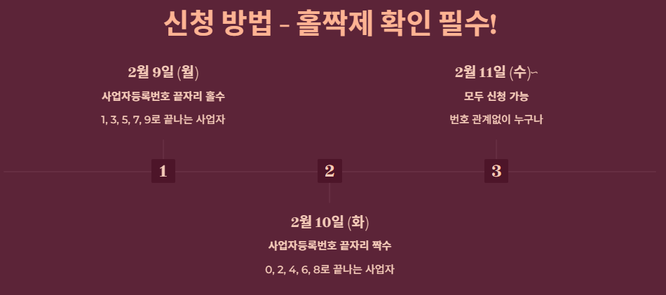 신청은 온라인을 통해 간편하게 진행할 수 있으며, 초기 혼잡을 막기 위해 사업자번호 끝자리 기준 2부제가 시행됩니다.