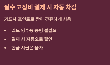 - 별도의 영수증 증빙 없이 선택한 카드로 결제 시 자동 차감되어 매우 편리합니다.