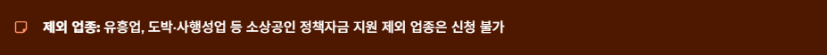 - ※ 제외 업종: 유흥업, 도박 및 사행성업 등 소상공인 정책자금 지원 제외 업종은 신청이 불가합니다.