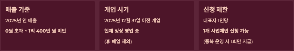 - 매출 기준: 2025년 연 매출이 0원 초과 ~ 1억 400만 원 미만인 소상공인