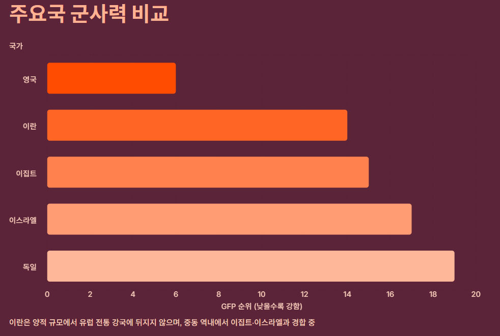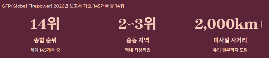 - 세계 14위: 이란은 양적으로는 세계 최강 수준의 군사 대국입니다.