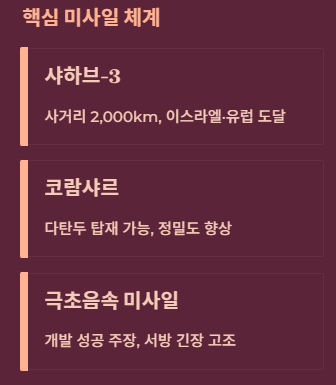 - 미사일과 드론: 첨단 공군력 대신 선택한 '가성비' 무기체계가 실질적인 위협이 됩니다.