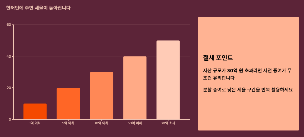 - 전문가들은 보통 자산 규모가 30억 원을 초과한다면 사전 증여가 무조건 유리하다고 조언합니다.