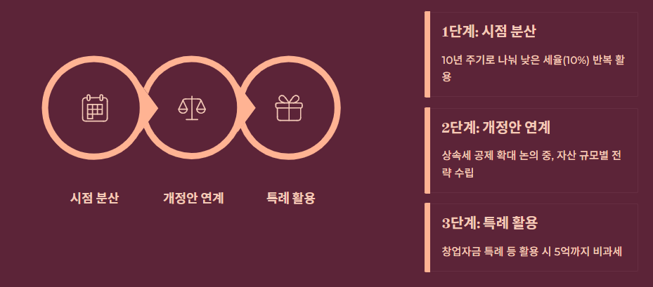 - 상속세 개정 추이를 살피되, 자산 가치 상승이 예상된다면 사전 증여가 답입니다.