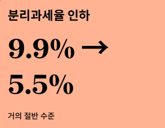 - 저율 과세: 현행 9.9%인 분리과세율을 5.5% 수준으로 낮추는 방안이 논의되고 있어, 고액 수익자들의 부담이 크게 줄어듭니다.