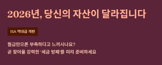 "내 집 마련, 노후 준비... 월급만으론 답이 안 나온다"며 한숨 쉬는 분들 많으시죠? 하지만 2026년, 우리에게 아주 강력한 '세금 방패'가 생길 예정입니다. 바로 ISA(개인종합자산관리계좌)의 파격적인 법 개정 소식인데요.