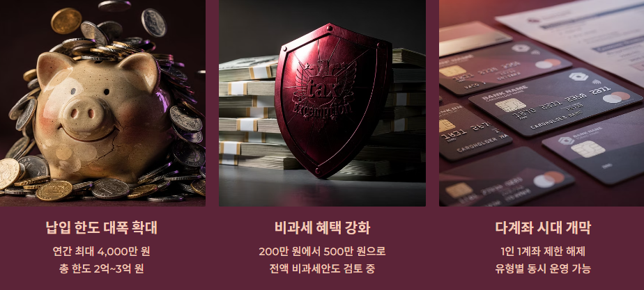 - 집중 투자 가능: 첫해에만 최대 2억 2,000만 원까지 납입할 수 있도록 하는 안이 있어, 목돈을 한꺼번에 절세 계좌로 옮기려는 분들에게 큰 기회가 될 전망입니다.