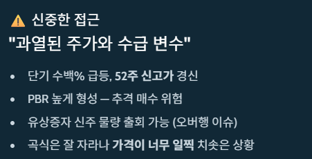 다만, 최근 주가가 단기간에 수백 퍼센트 급등하며 '52주 신고가' 를 경신한 상태입니다. 2026년 3월 말 기준으로 주가수익비율(PBR)이 다소 높게 형성되어 있어, 무지성 추격 매수는 위험할 수 있습니다. 또한, 과거 발행했던 유상증자 신주 물량이 시장에 나올 수 있다는 점(오버행 이슈)도 고려해야 합니다. 농사로 치면, 곡식은 잘 자라고 있으나 시장 가격이 너무 일찍 치솟은 상황이라 할 수 있습니다.