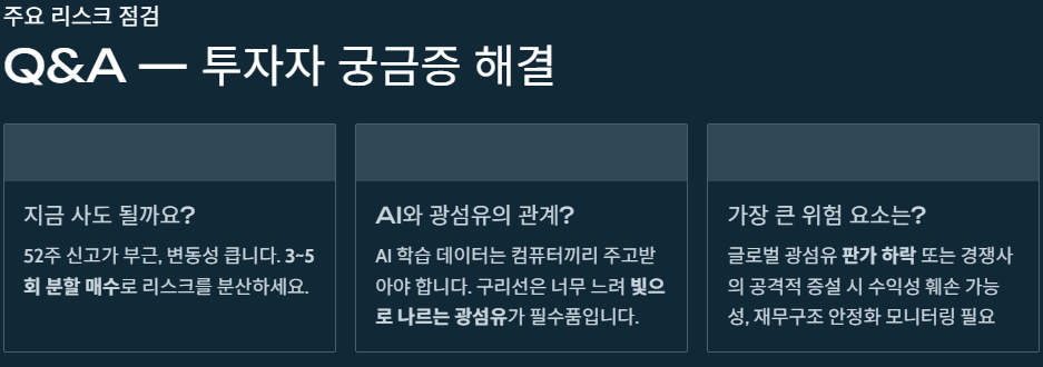 A3. 과거 적자가 길었던 만큼 재무 구조의 완전한 안정화 여부를 지켜봐야 합니다. 또한, 글로벌 광섬유 가격(판가)이 하락하거나 경쟁사들이 공격적으로 증설할 경우 수익성이 예상보다 낮아질 수 있다는 점을 주의해야 합니다.