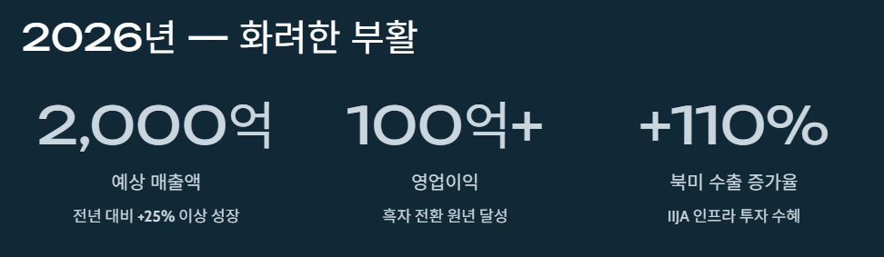 - 흑자 전환의 원년: 증권가에서는 2026년 매출액이 전년 대비 25% 이상 성장한 약 2,000억 원대를 기록하고, 영업이익 또한 100억 원 이상으로 흑자 전환할 것으로 내다보고 있습니다.