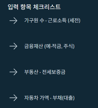 - 입력 항목: 가구원 수, 근로소득, 금융재산(예적금·주식), 부동산, 부채(대출) 등을 빠짐없이 넣으세요.