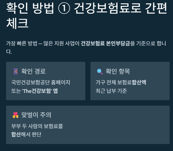 ※ 주의: 위 금액은 참고용이며, 지원 사업마다 건강보험료 본인부담금을 기준으로 보거나 소득·재산을 합친 '소득인정액'을 보는 등 산정 방식이 다를 수 있습니다.