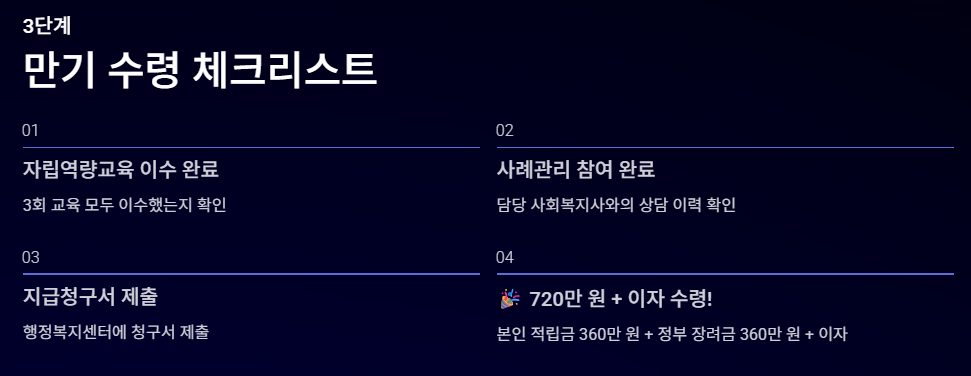 3년 만기 시, 본인 적립금(360만 원) + 정부 장려금(360만 원) + 이자를 모두 받으려면 다음 조건을 충족해야 합니다.