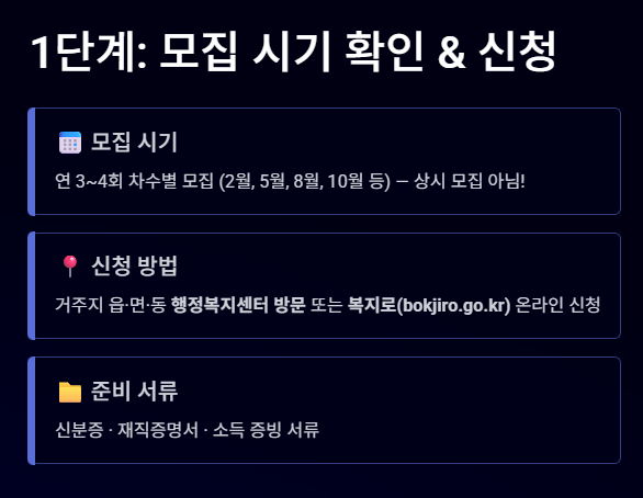 • 어디서?: 거주지 읍·면·동 행정복지센터 방문 신청 또는 복지로(bokjiro.go.kr) 온라인 신청.