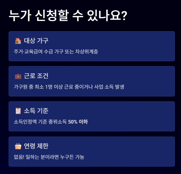 • 근로 조건: 가구원 중 최소 1명 이상이 현재 근로 중이거나 사업을 운영하며 소득이 발생해야 합니다.