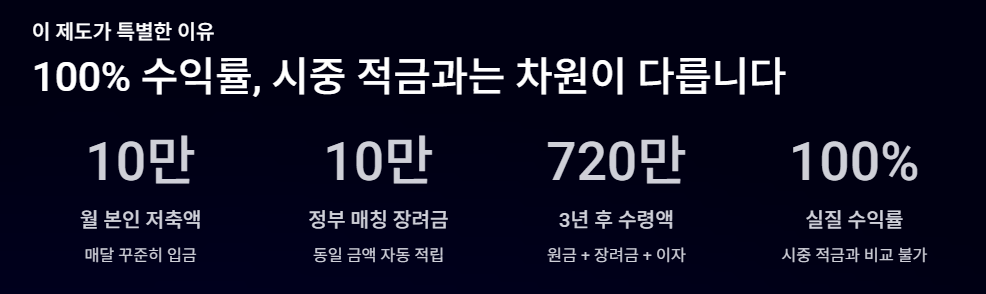 3. 혜택: 3년 후 본인 저축액 2배(720만 원) + 이자 수령.