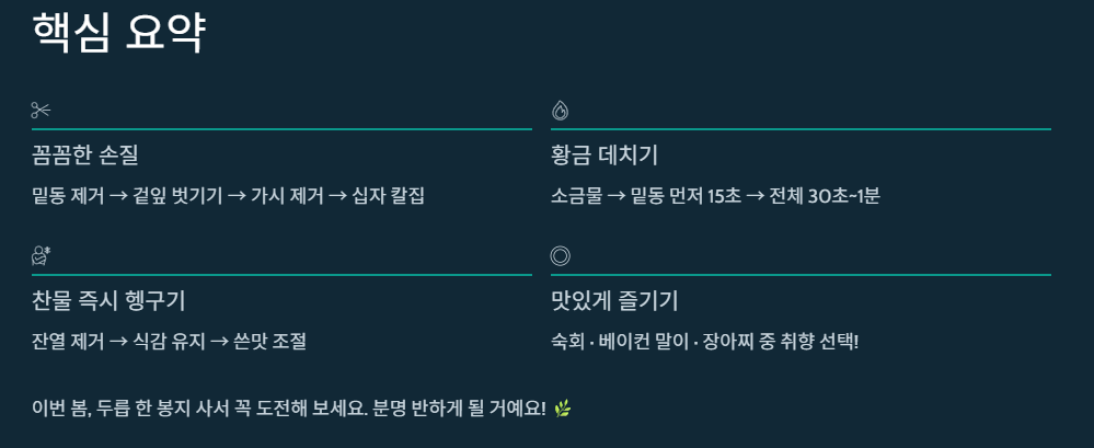 두릅은 손질부터 데치는 타이밍이 핵심입니다. 아래 단계를 따라 하시면 초보자도 전문가처럼 아삭한 식감을 살릴 수 있습니다.