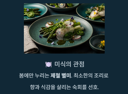봄철에만 짧게 즐길 수 있는 제철 별미로서의 가치입니다. 특유의 '향'을 즐기기 위해 최소한의 조리법(숙회)을 선호하며, 식감을 해치는 과도한 양념을 경계합니다.