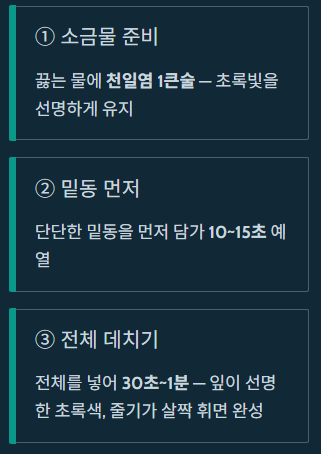 - 밑동부터 입수: 잎보다 단단한 밑동 부분을 먼저 뜨거운 물에 담가 약 10~15초간 먼저 익혀줍니다.