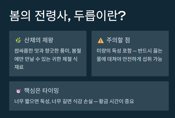어떤 관점이든 중요한 것은 제대로 된 세척과 데치기입니다. 두릅의 독성인 '알칼로이드' 성분은 반드시 끓는 물에 데쳐야 안전하게 섭취할 수 있다는 점을 잊지 마세요!