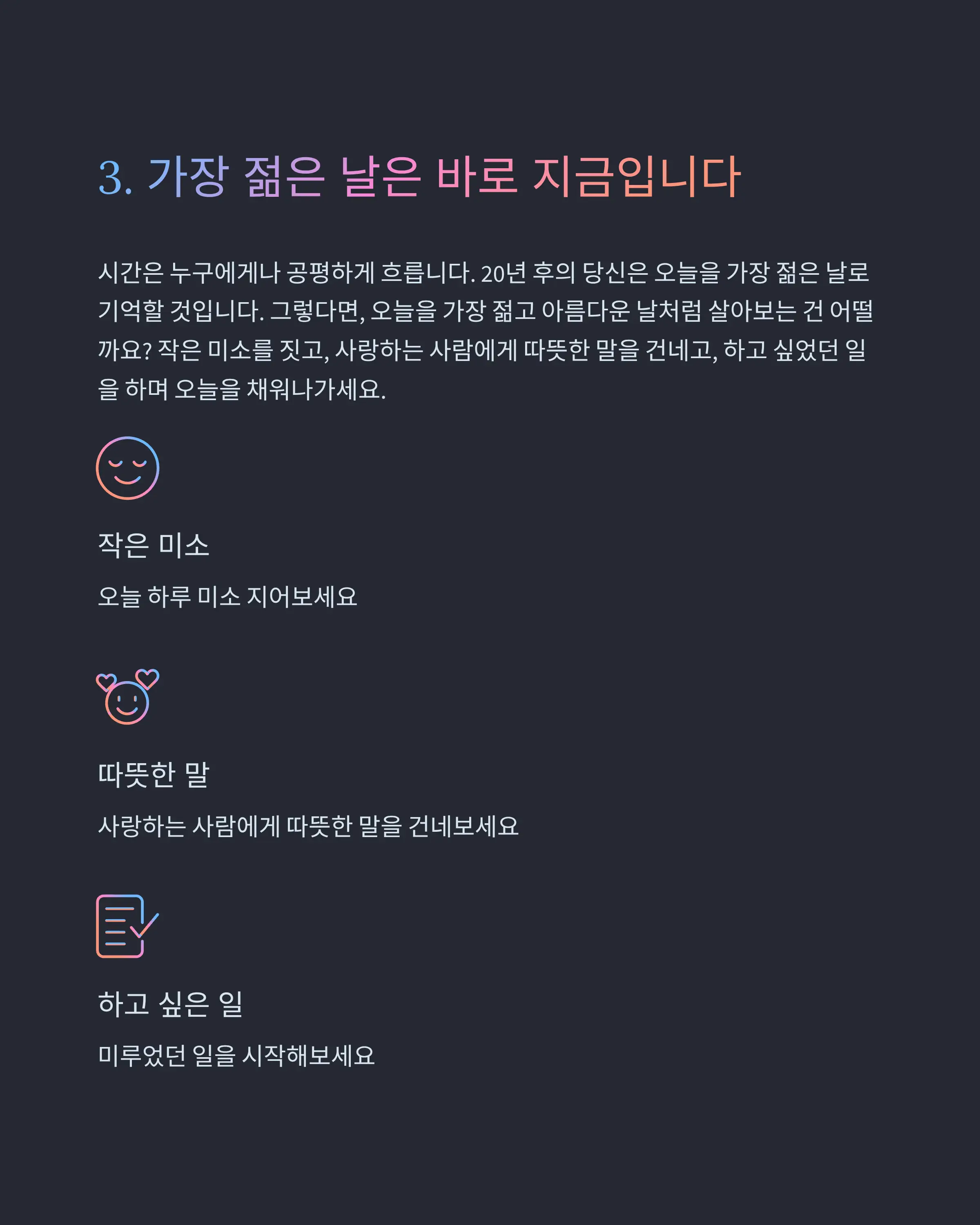시간은 누구에게나 공평하게 흐릅니다. 20년 후의 당신은 오늘을 가장 젊은 날로 기억할 것입니다. 그렇다면, 오늘을 가장 젊고 아름다운 날처럼 살아보는 건 어떨까요? 작은 미소를 짓고, 사랑하는 사람에게 따뜻한 말을 건네고, 하고 싶었던 일을 하며 오늘을 채워나가세요.