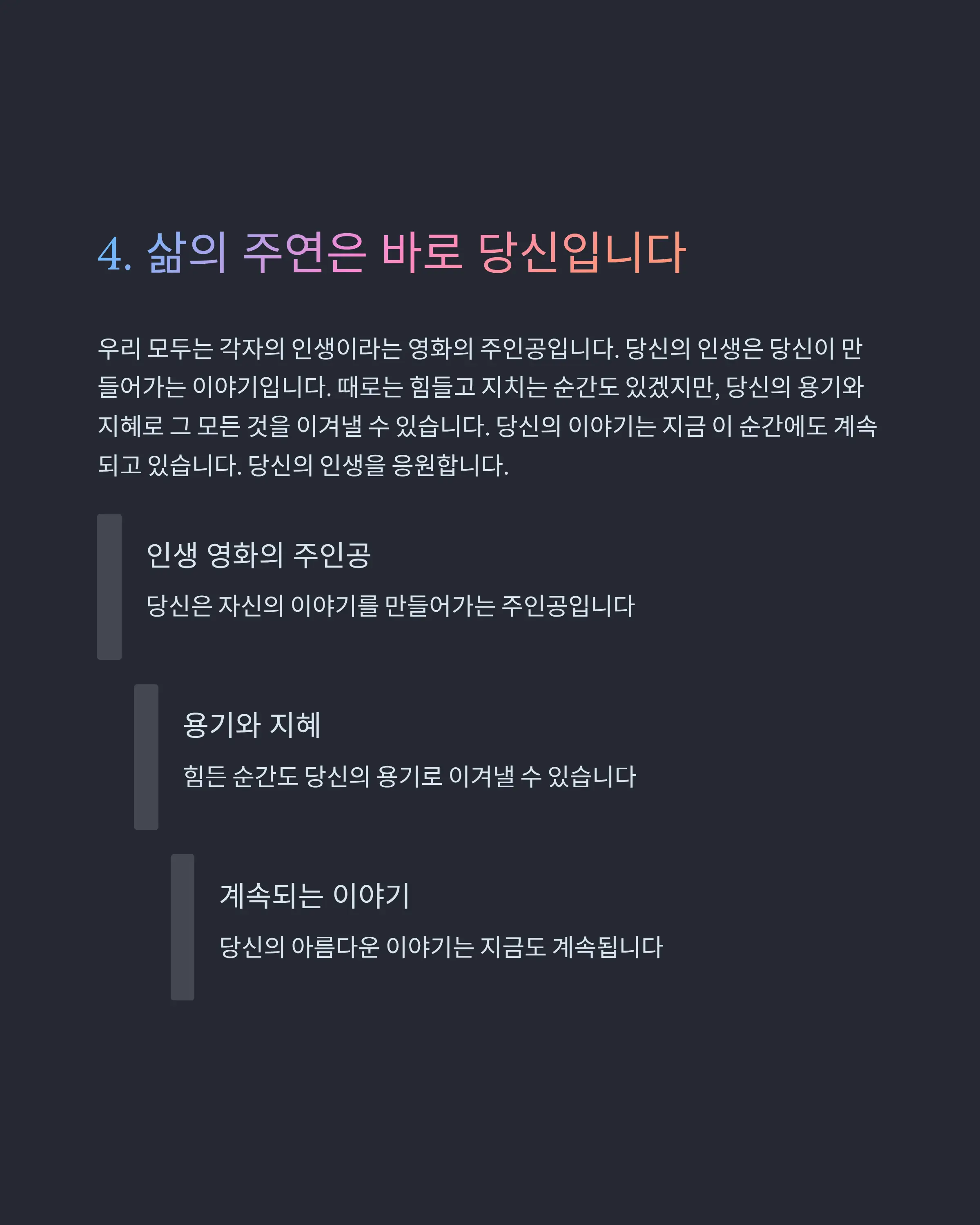 우리 모두는 각자의 인생이라는 영화의 주인공입니다. 당신의 인생은 당신이 만들어가는 이야기입니다. 때로는 힘들고 지치는 순간도 있겠지만, 당신의 용기와 지혜로 그 모든 것을 이겨낼 수 있습니다. 당신의 이야기는 지금 이 순간에도 계속되고 있습니다. 당신의 인생을 응원합니다.