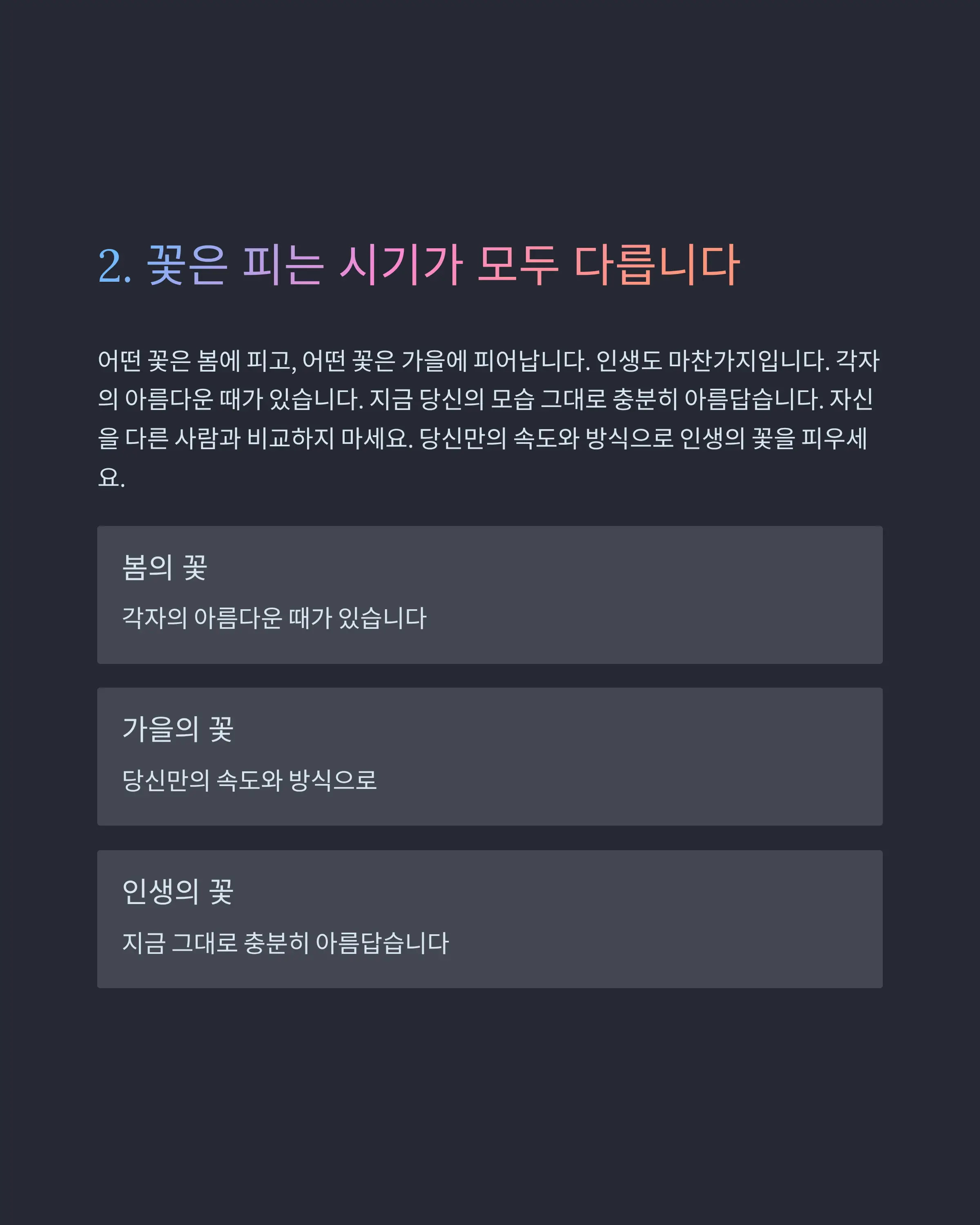 어떤 꽃은 봄에 피고, 어떤 꽃은 가을에 피어납니다. 인생도 마찬가지입니다. 각자의 아름다운 때가 있습니다. 지금 당신의 모습 그대로 충분히 아름답습니다. 자신을 다른 사람과 비교하지 마세요. 당신만의 속도와 방식으로 인생의 꽃을 피우세요.