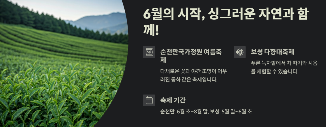 보성 녹차밭의 푸르름을 느낄 수 있는 다향대축제도 6월에 열릴 때가 있어요. 신선한 녹차를 직접 맛보고, 녹차 따기 체험도 할 수 있어서 오감 만족 힐링 여행이 가능한 축제죠. 차를 좋아하는 분들이라면 절대 놓쳐서는 안 될 축제라고 생각합니다. 저도 언젠가 꼭 한 번 가보고 싶은 곳이에요!