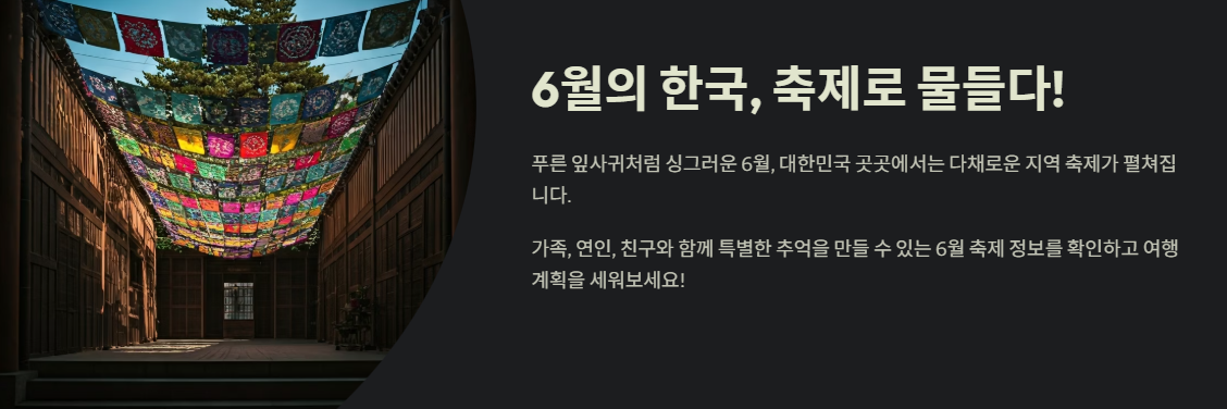 - 6월은 축제의 계절: 싱그러운 여름의 시작을 알리는 6월에는 자연, 문화, 음악 등 정말 다양한 테마의 축제들이 전국 곳곳에서 열려요.