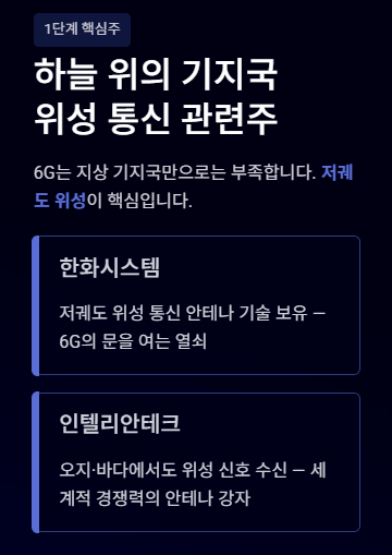 2. 핵심 종목: 위성 통신의 한화시스템, 인텔리안테크 / 장비의 삼성전자, 서진시스템 등.