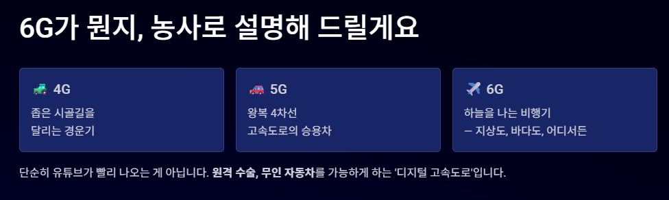 과거 4G가 '좁은 시골길을 다니는 경운기'였다면, 5G는 '왕복 4차선 고속도로를 달리는 승용차'입니다. 그렇다면 6G는 무엇일까요? 바로 '하늘을 나는 비행기' 라고 생각하시면 됩니다. 지상뿐만 아니라 저궤도 위성까지 활용해 하늘과 바다, 어디서든 끊김 없이 초고속 데이터를 주고받는 기술이죠.