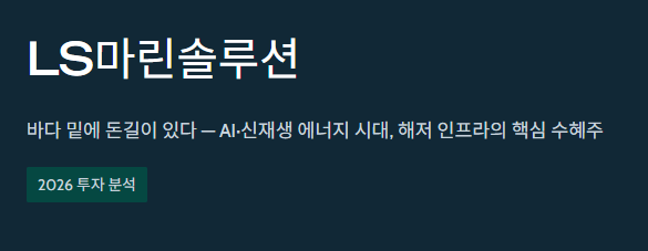 최근 우리 사회는 인공지능(AI)과 신재생 에너지라는 거대한 물결 속에 있습니다. 이 물결 위를 항해하며 가장 큰 수혜를 입고 있는 기업 중 하나가 바로 LS마린솔루션입니다. "바다 밑에 돈길이 있다"는 말이 나올 정도로 해저 인프라에 대한 관심이 뜨거운데요. 오늘은 이 기업이 왜 2026년 주식 시장의 중심에 서 있는지, 그 내실을 꼼꼼히 분석해 드리겠습니다.