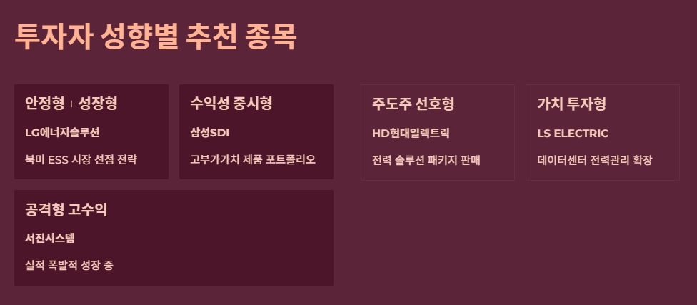 | HD현대일렉트릭 | 변압기와 ESS를 결합한 전력 솔루션 패키지 판매 강세 | 주도주 선호형 |