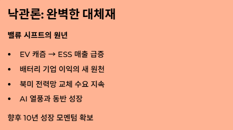 - 투자 전략: 단기 테마가 아닌 인프라 사업으로 접근하세요. 특히 IRA 보조금(AMPC) 혜택이 실적에 찍히는 종목이 진짜입니다.