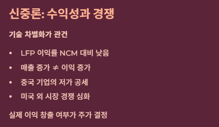 LFP 배터리는 NCM(니켈·코발트·망간)보다 이익률이 낮습니다. 매출은 늘어도 실제 이익이 얼마나 남을지가 관건이죠. 또한, 미국 외 시장에서는 여전히 중국 기업들의 저가 공세가 거세기 때문에, 한국 기업들이 **'기술 차별화'**를 얼마나 확실히 보여주느냐가 주가 향방을 결정할 것이라는 신중한 의견입니다.