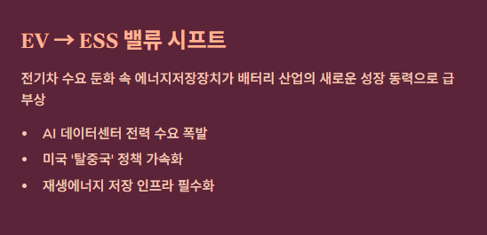전기차 시장이 캐즘(Chasm)에 빠진 사이, ESS 매출 비중이 급격히 늘어나고 있습니다. 2026년은 배터리 기업들의 이익 중 상당수가 ESS에서 나오는 **'밸류 시프트(Value Shift)'**의 원년입니다. 북미 전력망 교체 수요와 AI 열풍이 꺾이지 않는 한, ESS는 향후 10년 성장을 보장한다는 시각입니다.