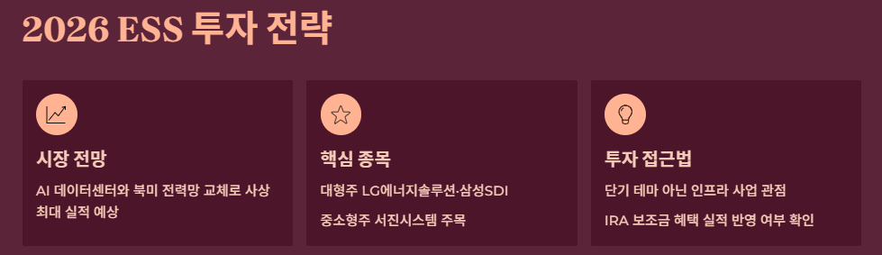 2026년은 ESS 산업이 단순한 테마를 넘어 **'구조적 성장기'**에 진입한 해입니다. 다음 세 가지 흐름을 먼저 이해해야 합니다.