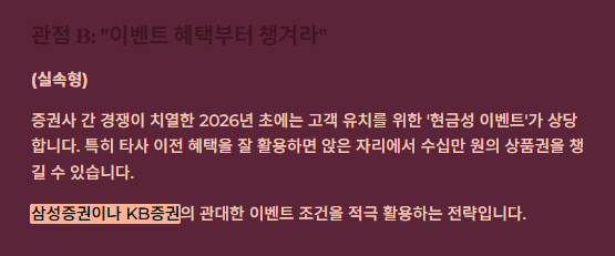 - 안정 추구형: 주식보다는 RP나 채권 등 확정 금리 상품을 선호하시나요? 특판 금리를 제공하는 증권사가 유리합니다.