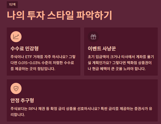 - 수수료 민감형: 주식이나 ETF 거래를 자주 하시나요? 그렇다면 0.015~0.03% 수준의 저렴한 수수료를 제공하는 곳이 정답입니다.