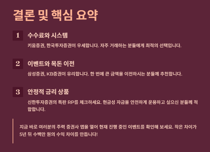 지금 바로 여러분의 주력 증권사 앱을 열어 현재 진행 중인 이벤트를 확인해 보세요. 작은 차이가 5년 뒤 수백만 원의 수익 차이를 만듭니다!