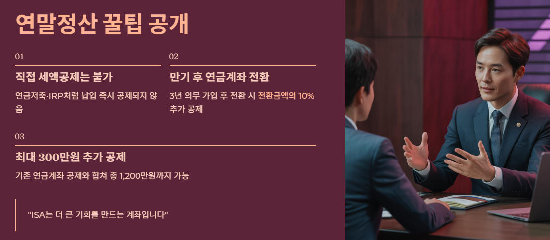 - 연말정산: ISA 자체 공제는 없지만, 만기 자금을 연금계좌로 옮기면 최대 300만 원 추가 공제.
