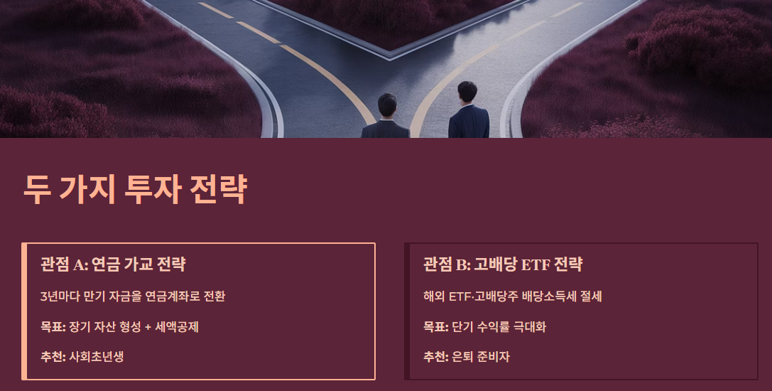 - 국내 상장된 해외 ETF(예: 미국 S&P500)나 고배당주에 투자할 때 발생하는 배당소득세를 아끼는 데 집중해야 한다는 의견입니다. 당장의 가처분 소득을 늘리는 것에 방점을 둡니다. (단기 수익률 중시)