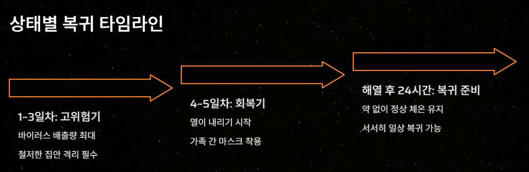 - 격리 기간: 증상 시작 후 5일 & 해열 후 24시간 유지