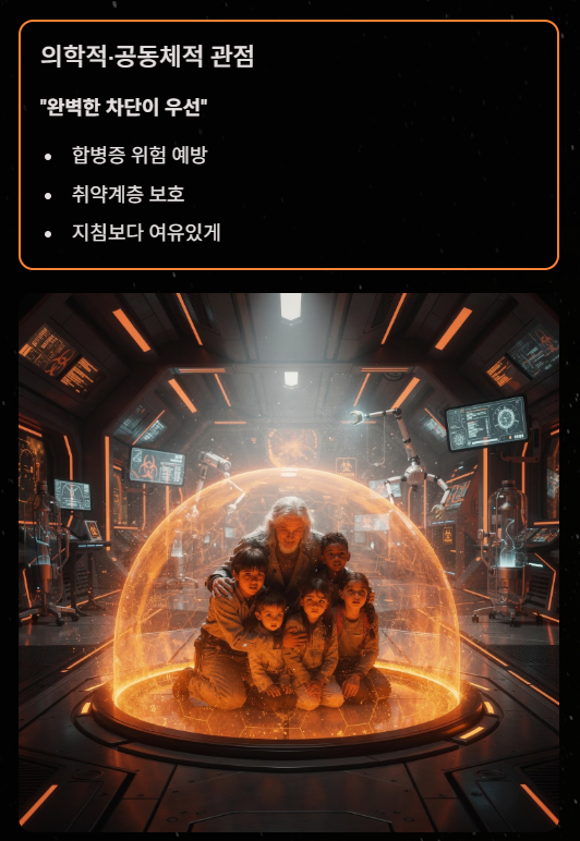 - 관점 1: "완벽한 차단이 우선" (의학적/공동체적 관점) 독감은 합병증(폐렴, 뇌증 등)으로 이어질 수 있는 위험한 질환입니다. 특히 면역력이 약한 영유아나 어르신에게는 치명적일 수 있으므로, 지침보다 하루 이틀 더 넉넉히 격리하여 전파 가능성을 아예 차단해야 한다는 입장입니다.