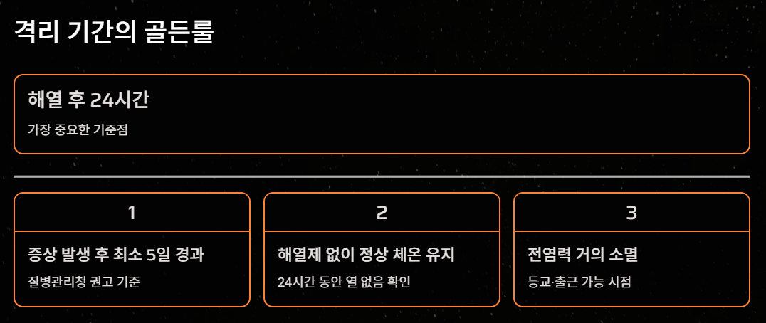 - 해열제 복용 없이 체온이 정상으로 돌아온 후 24시간 경과