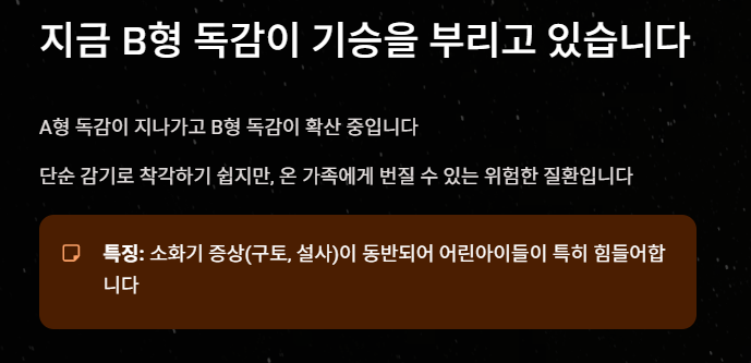 - 주요 증상: 갑작스러운 고열(38도 이상), 오한, 두통, 근육통이 특징입니다. B형 독감은 A형보다 증상이 다소 완만하다고 알려져 있지만, 구토나 설사 같은 소화기 증상이 동반되는 경우가 많아 어린아이들이 특히 힘들어합니다.