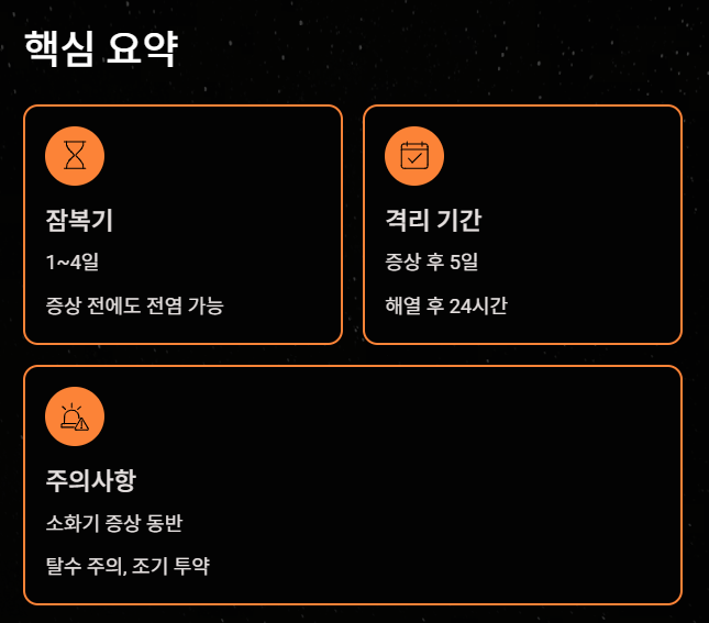 - 잠복기: 1~4일 (증상 전에도 전염 가능)