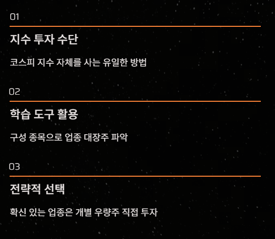 • 지수 투자의 수단: 코스피 지수 자체를 사고 싶다면 ETF가 유일한 대안입니다. [21:54]