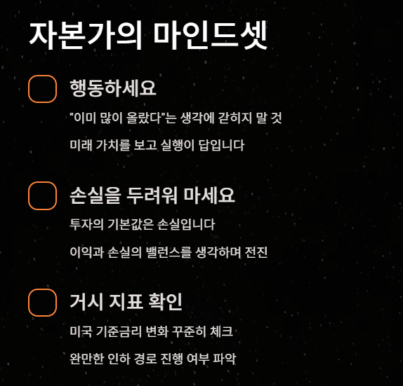 1. 행동하세요: "이미 많이 올랐다"는 생각에 갇히지 말고 미래 가치를 보세요. 실행이 가장 현명한 방법입니다. [23:45]