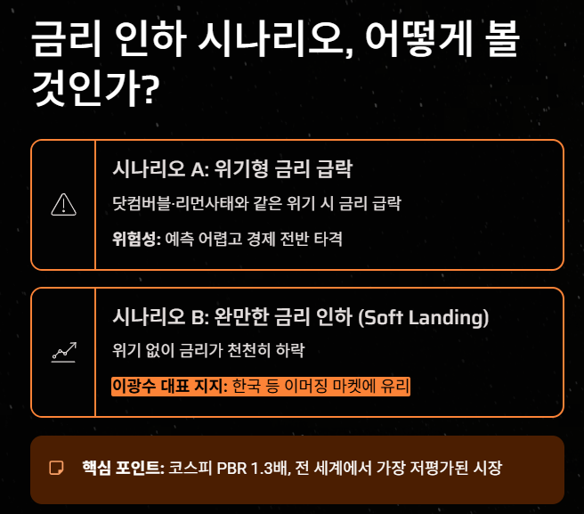 관점 B: "완만하게 금리가 떨어질 것이다 (Soft Landing)" 이광수 대표가 지지하는 관점입니다. 위기 없이 금리가 천천히 낮아진다면, 고평가된 미국 나스닥보다 상대적으로 저평가된 한국 등 이머징 마켓이 훨씬 매력적인 투자처가 됩니다. [15:36]